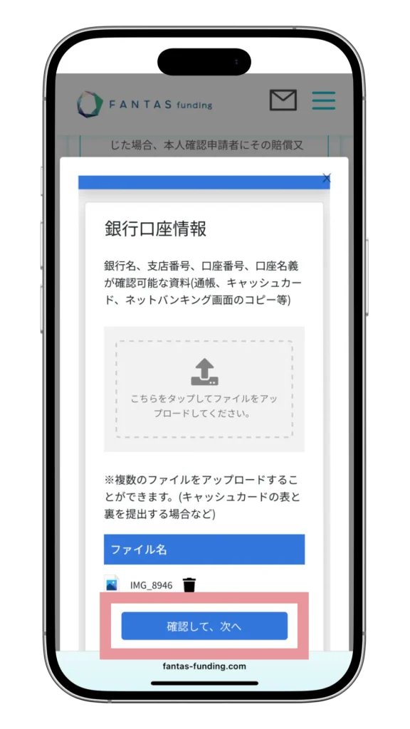 次の画面で、銀行口座情報がわかる写真またはスクリーンショットをアップロードします。