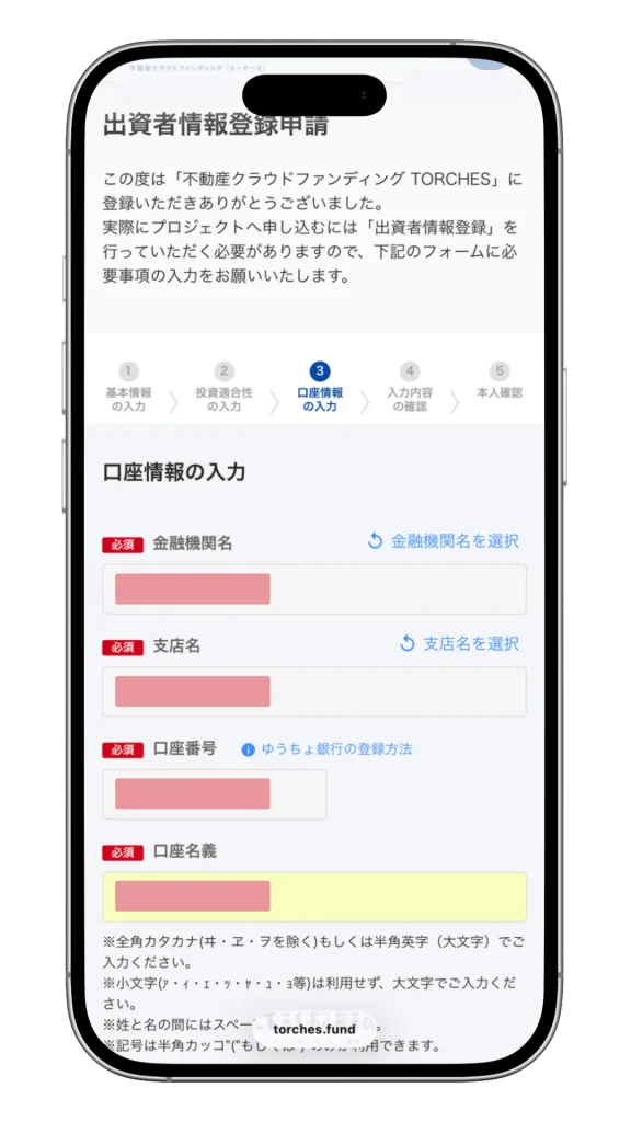 続いて、TORCHESに振り込んだり、利益の振込先に指定したりする銀行口座を登録しましょう。